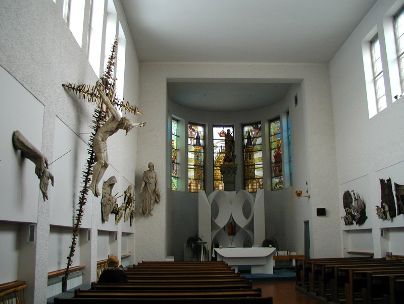 Kříž roste z dlážděné kostelní podlahy jako strom a přečnívá všechna ostatní zastavení Křížové cesty. Na něm visí Ježíšova postava v nadživotní velikosti. Kříž je vyroben ze zlatých paprsků, které připomínají ostnatý drát, vězení a smrt. Jejich zlatá barva však dosvědčuje, že zkáza a smrt nebudou mít poslední slovo. Strom kříže, který přinesl smrt, se stane stromem života.